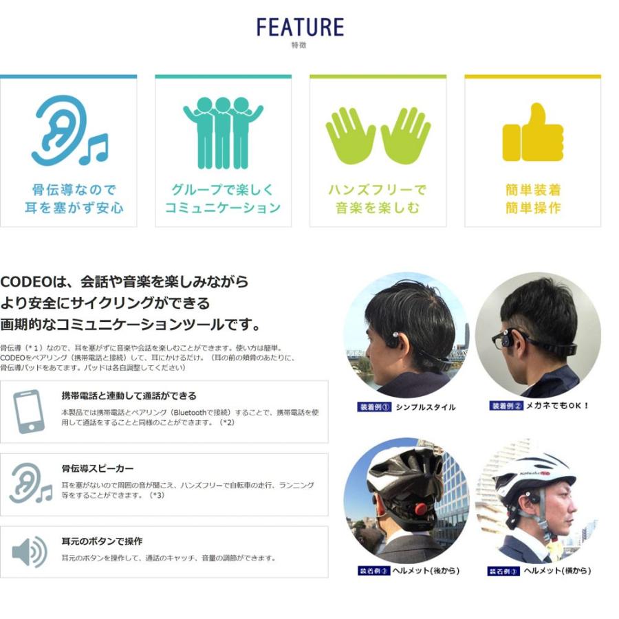 | 商品の特徴 | 周囲の音が聞けて安心/耳をふさがない骨伝導ワイヤレス CODEO(コデオ。CODEO(コデオ)BTL-G001骨伝導 ワイヤレスヘッドホン 送料無料。周囲の音が聞けて安心/耳をふさがない骨伝導ワイヤレス CODEO(コデオ。耳を塞がない骨伝導タイプのヘッドフォンです。1-2度練習の際に使用しました。使用感はありません。詳しくは以下の販売サイトのコピーをご覧ください。=====骨伝導スピーカーで耳を塞がないので周囲の音が聞こえます。本製品をBluetoothでペアリング(携帯電話やスマートホンと接続)して、耳にかけるだけ。生活防水を超えるIP4(防沫)で、多少の雨、汗にも安心。bluetoothのバージョン4.1+EDR。マルチペアリング機能で、本製品1台で携帯(Bluetooth機器)8台登録可能。電波法令で定めている技術基準に適合している無線機であることを示す技適マークを本体に表示しています。=====周波数特性60Hz-20,000HzS/N比82db以上ペアリング情報記録数最大8台(マルチペアリング機能)同時待受端末台数最大2台(マルチポイント機能)伝送距離Class2 最大半径 10m(障害物なきこと)連続待機時間300時間充電方式DC5V Micro-USB(USB2.0)コネクタ使用バッテリーリチウムポリマー充電池3.7V 320mAH色:ブラック通信方式:BluetoothR 4.1+EDR 対応プロファイル:A2DP、AVRCP、HSP、HFP対応機種:Android4.3以上 ios7.0以上防水性能:IP4(防沫)充電時間:約2.5時間動作時間:音楽連続再生7時間、連続通話9時間動作温度:-20℃〜55℃重量:70gロードバイク サイクリング ツーリング ハンズフリー BONX Bluetooth スノーボード。CODEO(コデオ)BTL-G001骨伝導 ワイヤレスヘッドホン 送料無料。ロードバイク初心者の友人とサイクリング時に通話しながらと思って購入。ヘッドホン Sony ult wear。【美品】audio-technica ATH-M50xBT2 ブラック。通算使用時間は2時間程度だと思います。logicool G735 ワイヤレスゲーミングヘッドセット。Logicool pro x 2 lightspeed ヘッドセット ホワイト。★元箱を捜索中のため、本体のみ2個の出品となります。Bose Quietcomfort 35 II ブラック ヘッドフォン。Razer BlackShark V3 ワイヤレスゲーミングヘッドセット。また、商品内容は写真に写っているもののみです。SONY WH-1000M5 ワイヤレスヘッドホン。ヘッドホン Fractal Design Scape。ハンズフリーで音楽や会話を楽しみながら、サイクリング、ランニング、散歩等をすることができます。【新品】Logicool G733 ワイヤレスゲーミングヘッドセット パープル。マール Beats Studio Pro ワイヤレスヘッドホン。耳元のボタンを操作して、通話のキャッチ、音量の調節ができます。オーディオテクニカ ATH-M50x 開封のみ。【イヤーパッド交換済 ほか】SONYヘッドホン MDR-HW700DS。前商品よりさらに柔軟性がアップし快適なつけ心地。Philips Fidelio X3 ヘッドホン。AKG K712 PRO 有線ヘッドホン。4.0以上は省電力化され動作時間が長持ちします。Yamaha YH-E700B ワイヤレスヘッドホン。【新品】HIFIMAN ハイファイマン SUNDARA 開放型平面駆動ヘッドホン。マルチポイント機能で、本製品1台でスマホ2台待ち受け可能。【新品未使用】B&W PX8 ダークフォレスト ワイヤレスヘッドホン。S*0様 Audio-Technica ATH-R50x 開放型 ヘッドホン。※技適マークのない製品を使用すると罰則対象になりますのでご注意ください。Beats Studio3 ACWコラボ | ||
